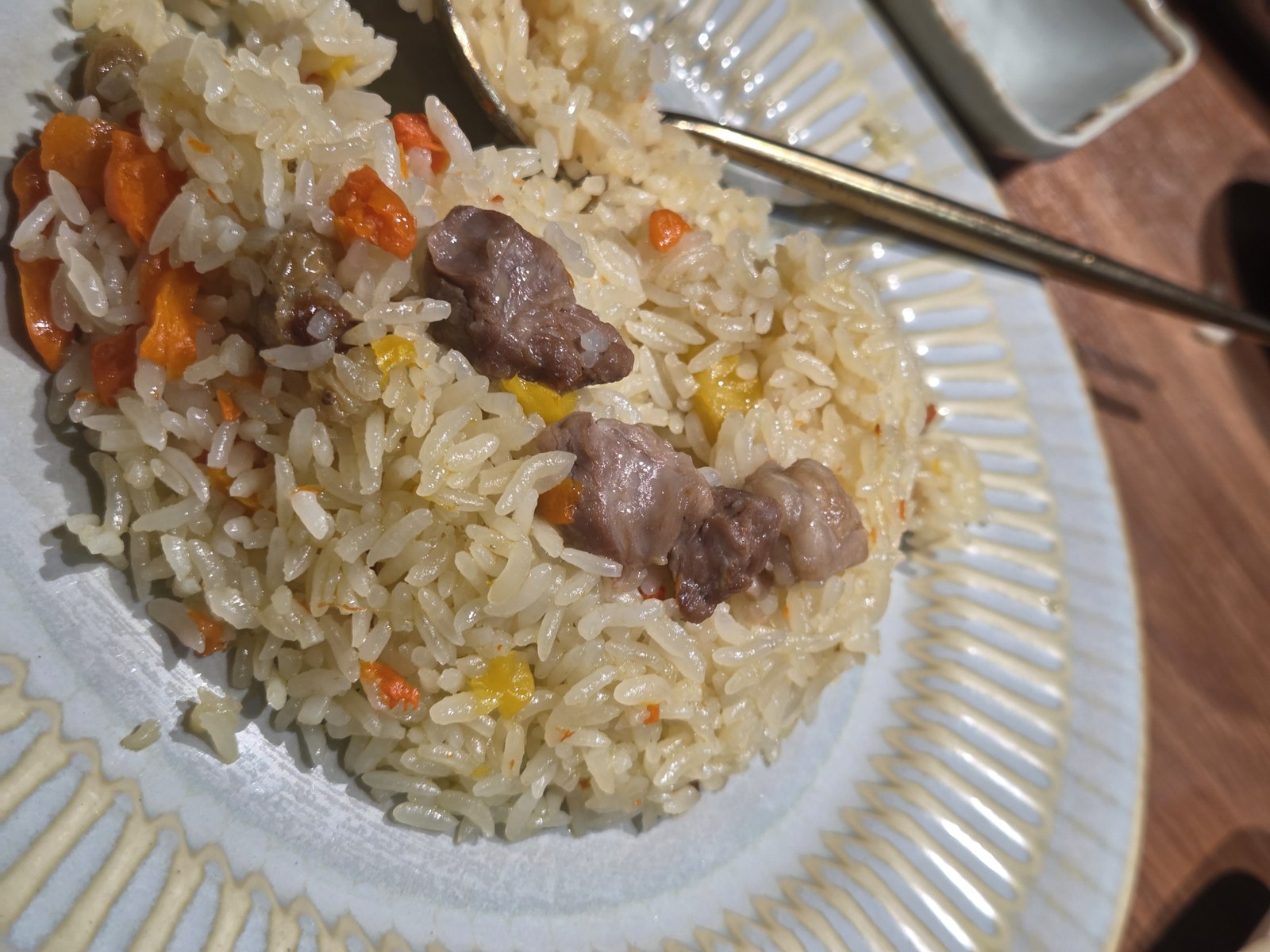 Nasi ni fav Aqilah. Dua kali datang dua kali dia mintak nasi ni. Rasa dia manis, berlemak. Manis tu datang dari kismis dan carrots.